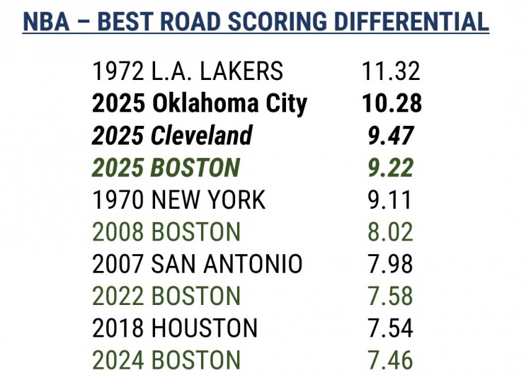 歷史單賽季客戰(zhàn)場均凈勝分榜:72年湖人第一 今年雷騎綠有望沖擊