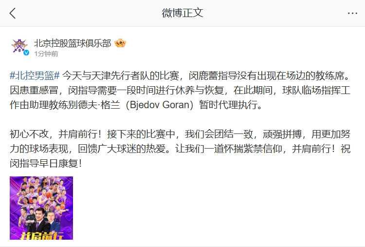 03月15日訊 北控男籃官宣:因患重感冒,閔指導(dǎo)需要一段時(shí)間進(jìn)行休養(yǎng)與恢復(fù),在此期間,球隊(duì)臨場指揮工作由助理教練別德夫·格蘭(Bjedov Goran)暫時(shí)代理執(zhí)行。
