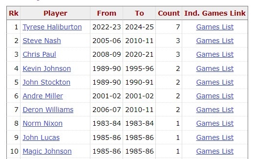 根據(jù)數(shù)據(jù)統(tǒng)計(jì),這是哈利伯頓生涯第8次打出單場至少20分15助并且0失誤的比賽,他在這一榜單上高居歷史第1。