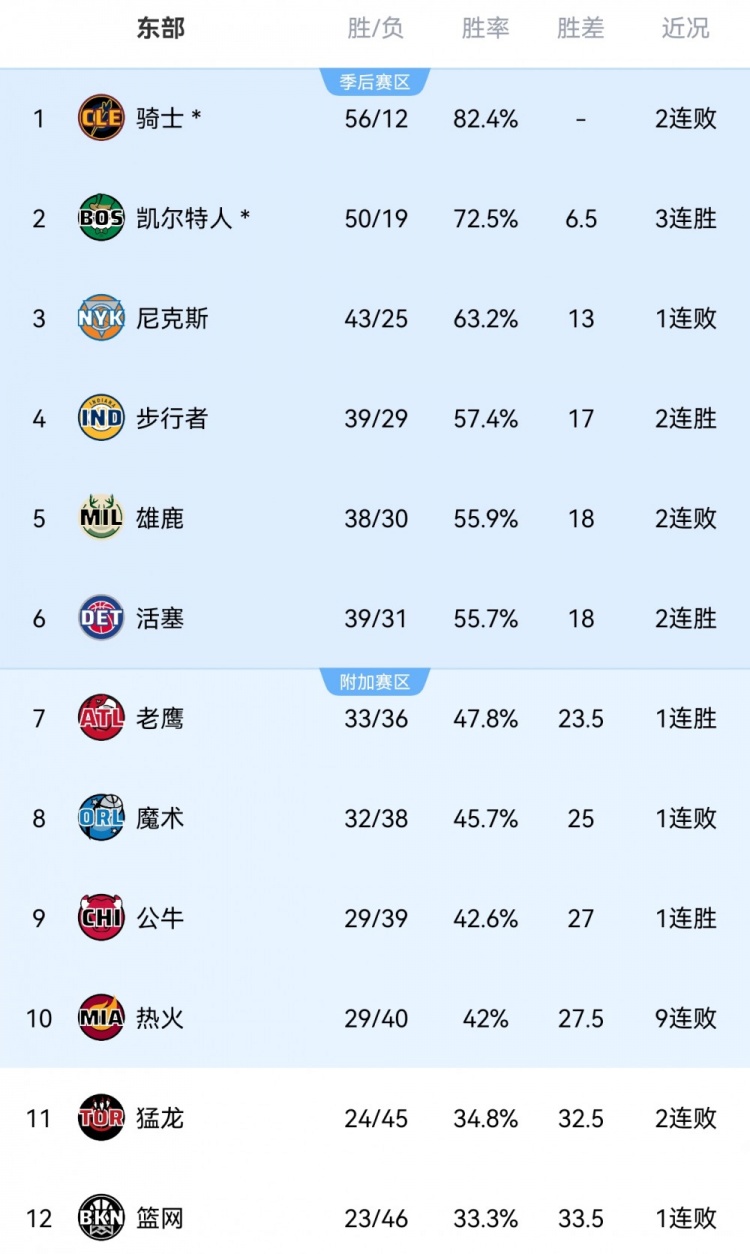 至此,熱火遭遇了9連敗。而他們排名仍在東部附加賽區(qū),仍領(lǐng)先第11的猛龍5個勝場。