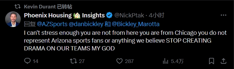 球迷一:我簡直不能更強調這一點,你不是本地人,你是芝加哥人,不能代表亞利桑那州的體育迷,也不能代表我們的任何想法。停止在我們的球隊制造鬧劇吧,老天??!