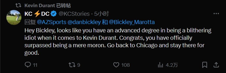 球迷三:嘿,看來你在"如何成為關于凱文-杜蘭特的胡說八道專家"這方面已經獲得了高等學位。恭喜你,你正式超越了一個普通的白癡????。趕緊滾回芝加哥,永遠待在那兒吧。