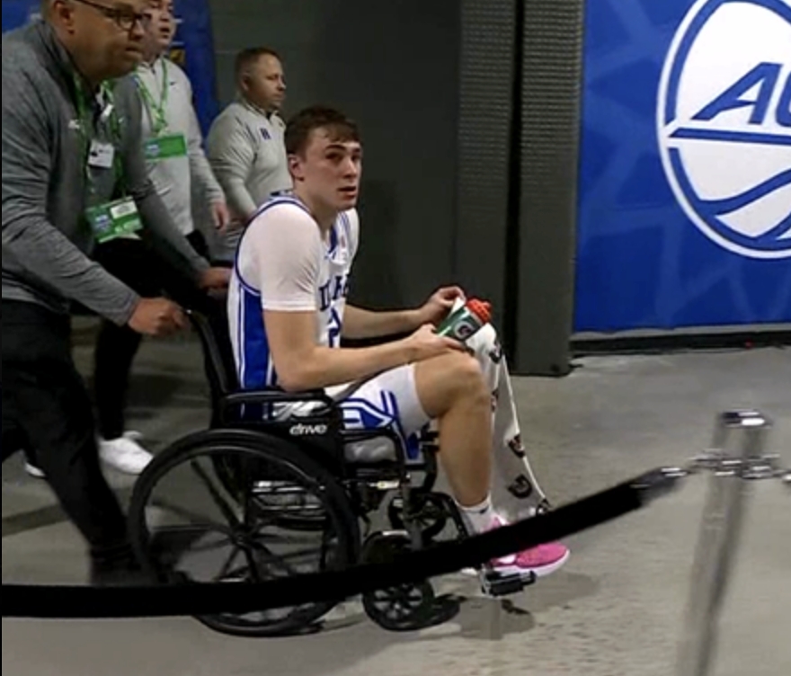 3月14日,ACC分區(qū)錦標(biāo)賽1/4決賽,杜克大學(xué)對陣佐治亞理工學(xué)院上半場,弗拉格在搶籃板落地時踩到對手恩東戈的腳上扭傷腳踝,他起身后被攙扶著走到場邊,之后坐著輪椅離場,在接受檢查之后自行走回球隊替補席,下半場沒有出戰(zhàn)。