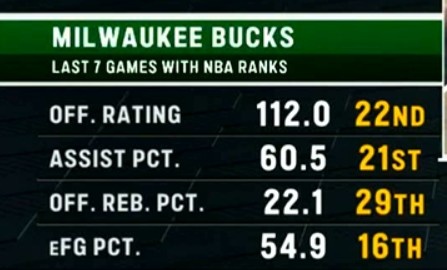 轉(zhuǎn)播方曬出一組數(shù)據(jù),在最近7場比賽中,雄鹿進攻便秘: