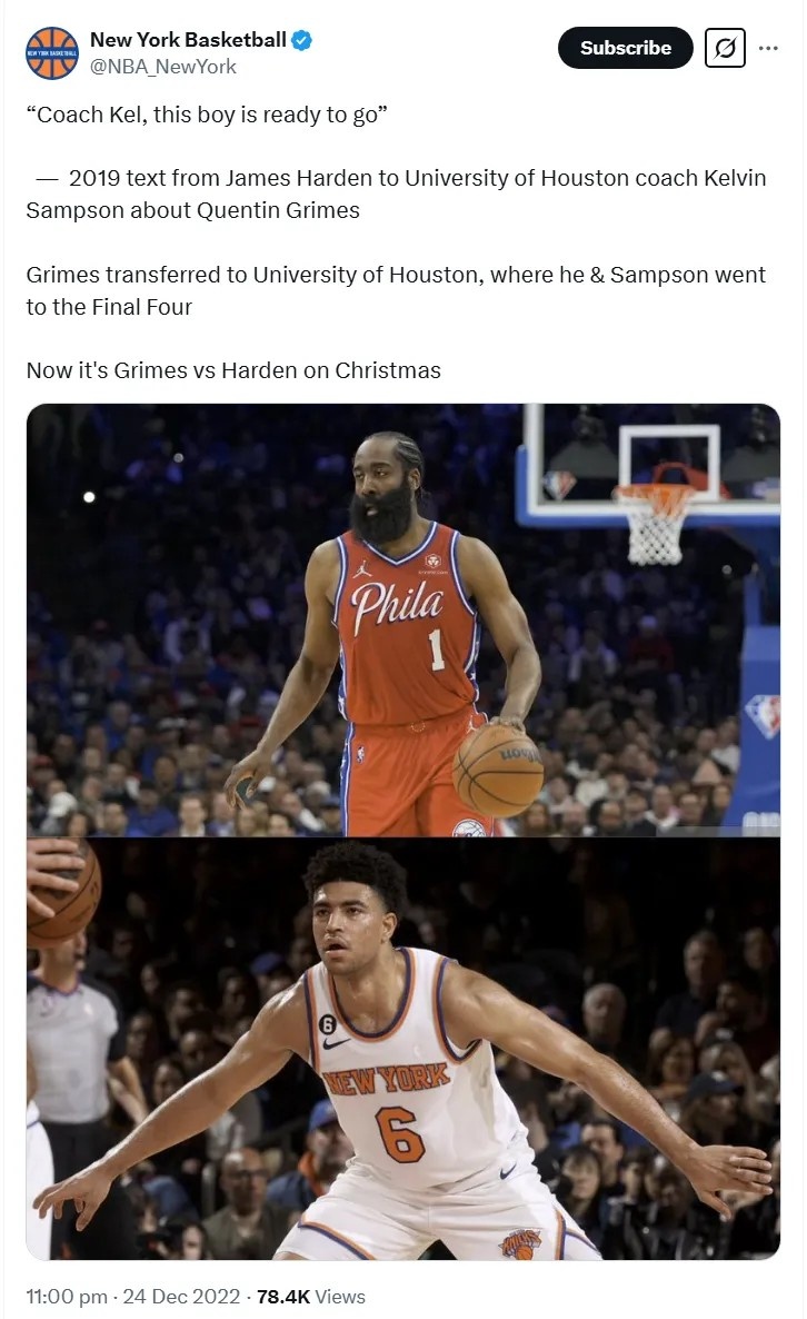 在休斯敦期間,格萊姆斯的擋拆防守和后場(chǎng)籃板能力大大提高了,這兩項(xiàng)后來成為了他在NBA的立足之本。2021年選秀大會(huì),他在首輪第25順位被尼克斯摘走——對(duì)于曾經(jīng)被看好拿下前五順位的天才來說,這個(gè)結(jié)果多少有些讓人失望,但格萊姆斯心態(tài)很好,這得益于他在學(xué)生時(shí)代一直養(yǎng)成的性格,格萊姆斯堅(jiān)信,就算兩年前他以高順位進(jìn)入NBA,該學(xué)的東西還是要從頭學(xué)起,從一個(gè)較低的起點(diǎn)出發(fā)不一定是壞事。