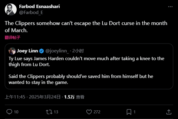 快船隊記Farbod Esnaashari發(fā)推表示:“快船在三月份似乎無法擺脫盧-多特的魔咒?!?/p>