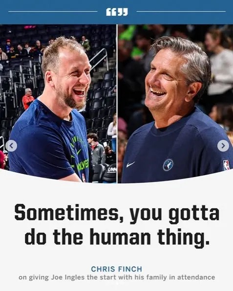 正因如此,當(dāng)芬奇知道雅各布還會(huì)接著觀(guān)看這一場(chǎng)與鵜鶘的比賽之后,他不想給英格爾斯和雅各布留下任何的遺憾。他首先找到了從爵士時(shí)期就與英格爾斯共事的老隊(duì)友康利,康利早就了解英格爾斯家庭的困境,毫不猶豫地表示支持,并主動(dòng)讓出了自己的首發(fā)位置。