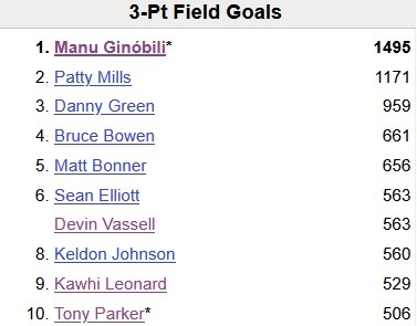 瓦塞爾馬刺生涯三分?jǐn)?shù)超越埃利奧特 獨(dú)占隊(duì)史第6位&馬努高居榜首