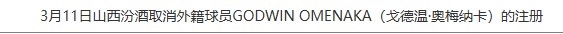 3月11日訊 今天,CBA官方更新了外籍球員注冊(cè)信息,山西男籃取消了戈德溫-奧梅納卡的注冊(cè)。