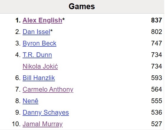 這是約基奇代表掘金出戰(zhàn)的第735場比賽,超越T.R-鄧恩,上升至隊(duì)史第四。