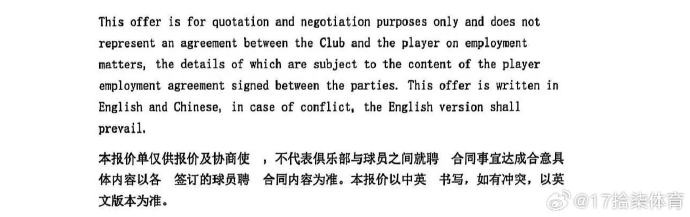 二 多家俱樂部對哈雷爾感興趣并進行了談判,其間另一家中方經(jīng)紀公司在浙江稠州銀行俱樂部與哈雷爾的談判過程中簽訂了一份報價單,其中明確約定“該報價單僅供報價和協(xié)商使用,不代表球員與俱樂部完成聘用合同簽約?!薄@也是浙江稠州銀行俱樂部多次公告中含糊其辭提及的“簽約”。最后,在多家俱樂部中談判協(xié)商中球員哈雷爾于二月十日選擇了簽約新疆廣匯俱樂部,三方按中國籃協(xié)和CBA公司要求簽訂了標準合同并在中國籃協(xié)完成了經(jīng)紀人備案。