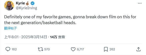 3月14日訊 此前,美媒發(fā)布了歐文5年前對(duì)陣公??诚?4分的集錦,歐文今天在社媒上進(jìn)行了回復(fù)。