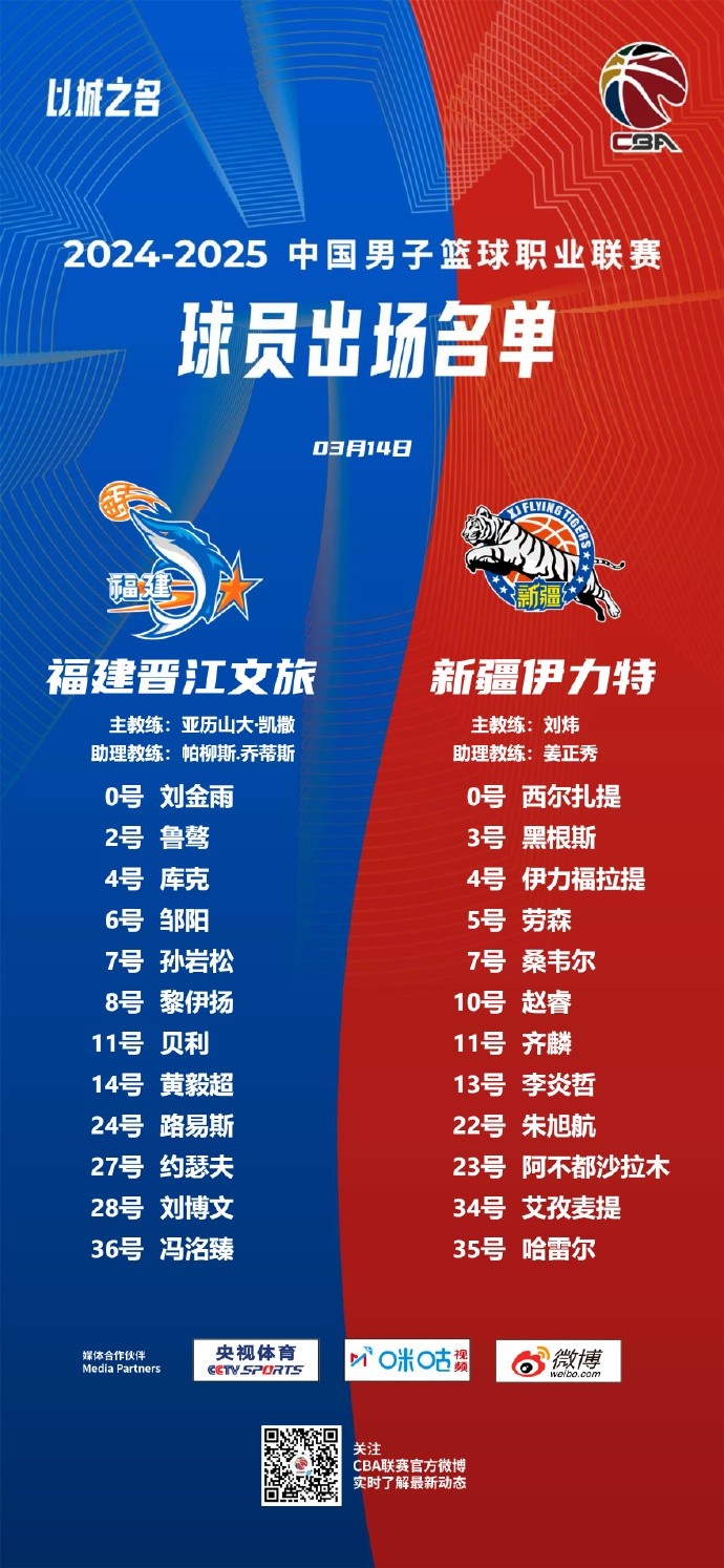 福建隊(duì):劉金雨、魯驁、庫(kù)克、鄒陽(yáng)、孫巖松、黎伊揚(yáng)、貝利-斯蒂爾、黃毅超、路易斯、約瑟夫-楊、劉博文、馮洺臻