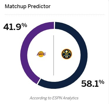 ESPN預(yù)測(cè)了本場(chǎng)比賽兩隊(duì)的勝率,其中湖人41.9%,掘金58.1%!