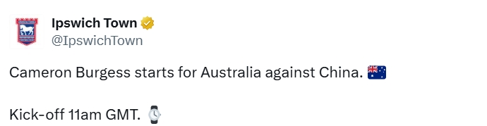 伊普斯維奇社媒:卡梅倫·伯吉斯首發(fā)代表澳大利亞隊(duì)對(duì)陣中國(guó)隊(duì)。格林威治時(shí)間上午11點(diǎn)開(kāi)球。