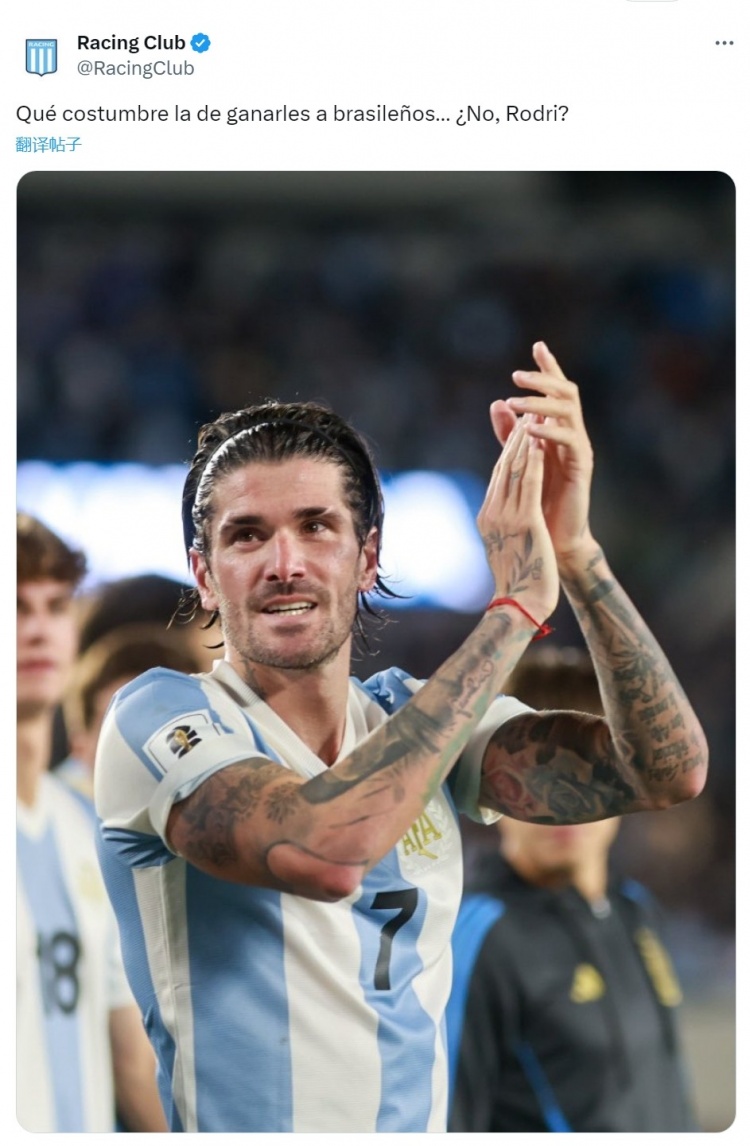 阿根廷競技俱樂部社媒曬出自家青訓(xùn)國腳德保羅的照片,并寫道:“擊敗巴西人真是成習(xí)慣了,對吧,德保羅?”