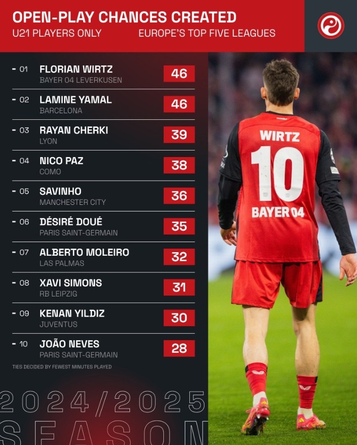 五大聯(lián)賽U21運(yùn)動(dòng)戰(zhàn)創(chuàng)造機(jī)會(huì)排行:亞馬爾、維爾茨46次并列榜首