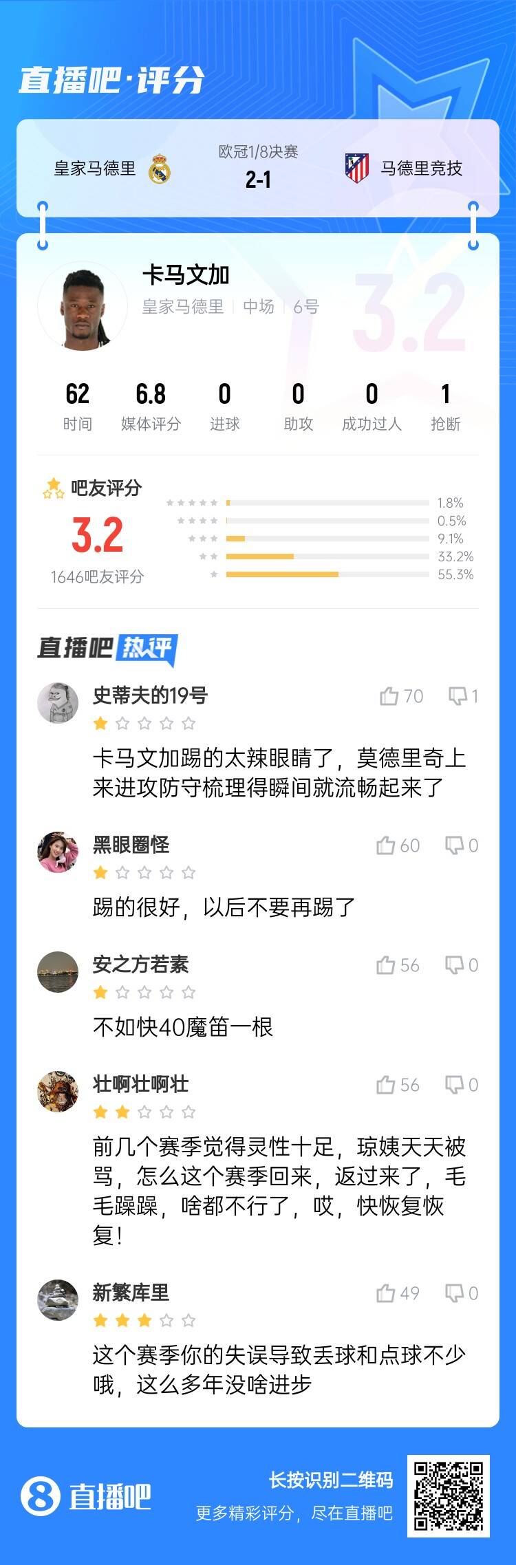 03月05日訊 歐冠1/8決賽首回合,皇馬2-1戰(zhàn)勝馬競,22歲的皇馬中場卡馬文加本場首發(fā)出戰(zhàn)62分鐘,表現(xiàn)不佳遭球迷痛批。