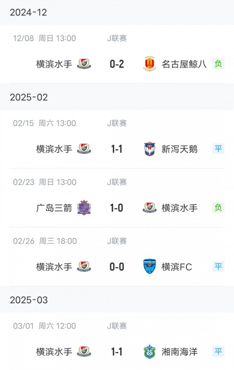 數據顯示,本賽季J聯賽戰(zhàn)罷5輪,橫濱水手還未嘗勝績,4輪聯賽(橫濱少賽一場)僅3平1負打進2球,目前積3分排在J聯賽積分榜第18位。而算上上賽季的話,橫濱水手在J聯賽已經連續(xù)5場不勝(3平2負打進2球丟掉5球)。