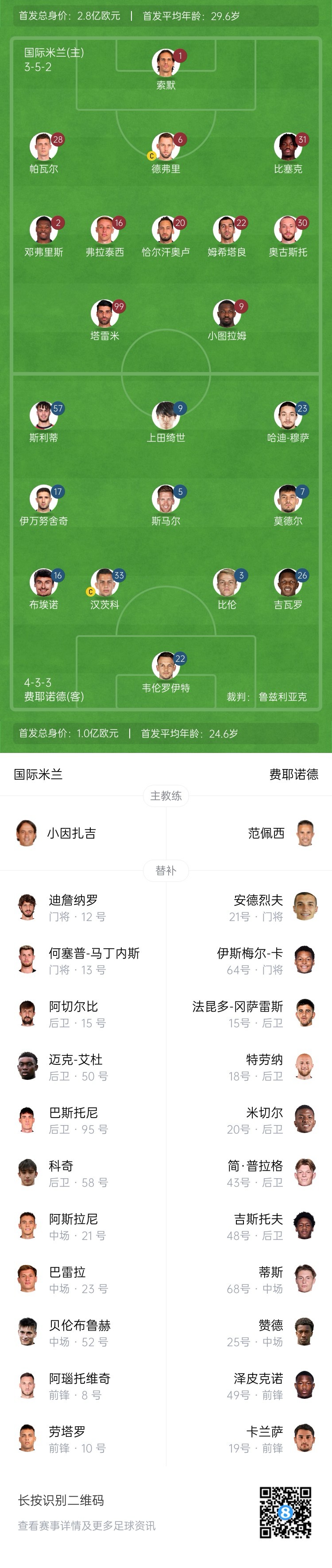國(guó)米原定首發(fā)為德弗里,開場(chǎng)前10分鐘消息,德弗里熱身出現(xiàn)傷情,阿切爾比進(jìn)入首發(fā)。