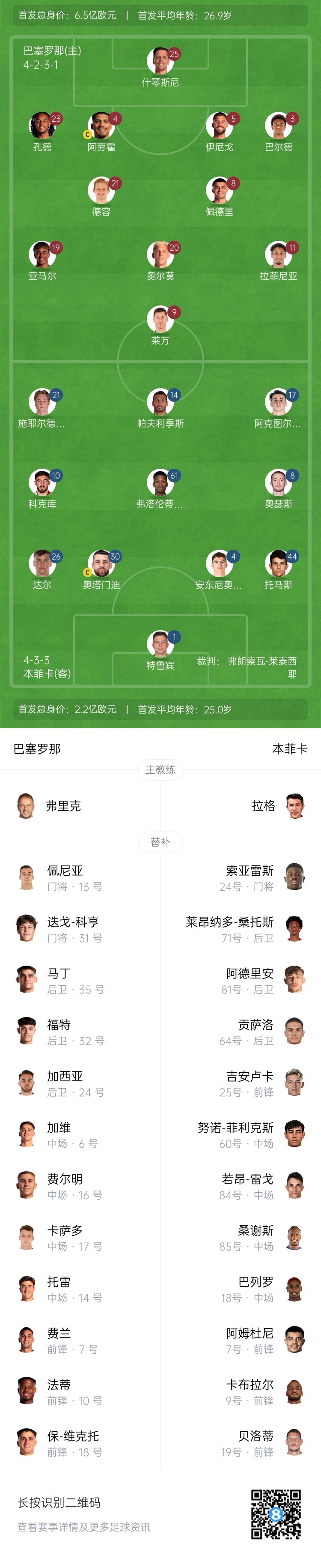 巴薩vs本菲卡首發(fā):萊萬、拉菲尼亞、亞馬爾先發(fā),奧爾莫出戰(zhàn)
