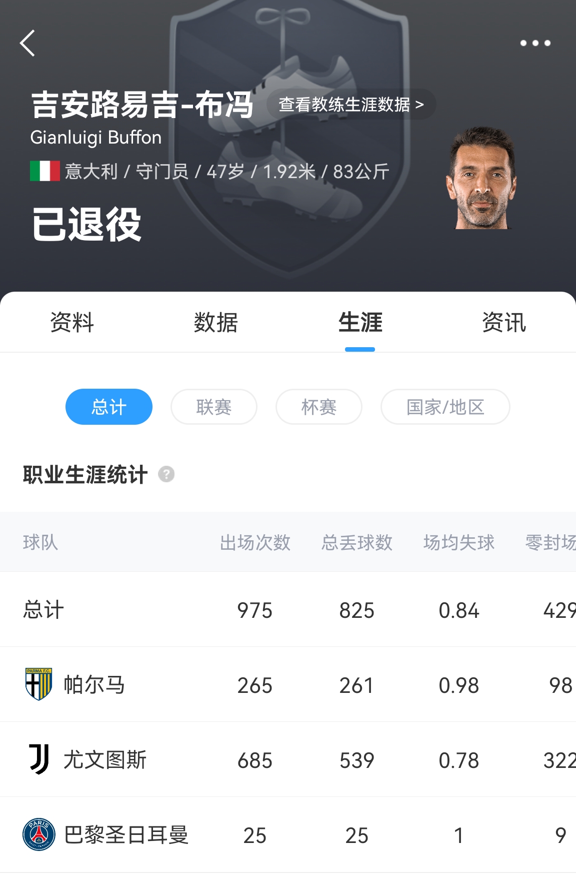 2023年8月45歲的布馮宣布退役時,他的俱樂部出場數(shù)達(dá)到了975場,國家隊出場數(shù)達(dá)到了176次。