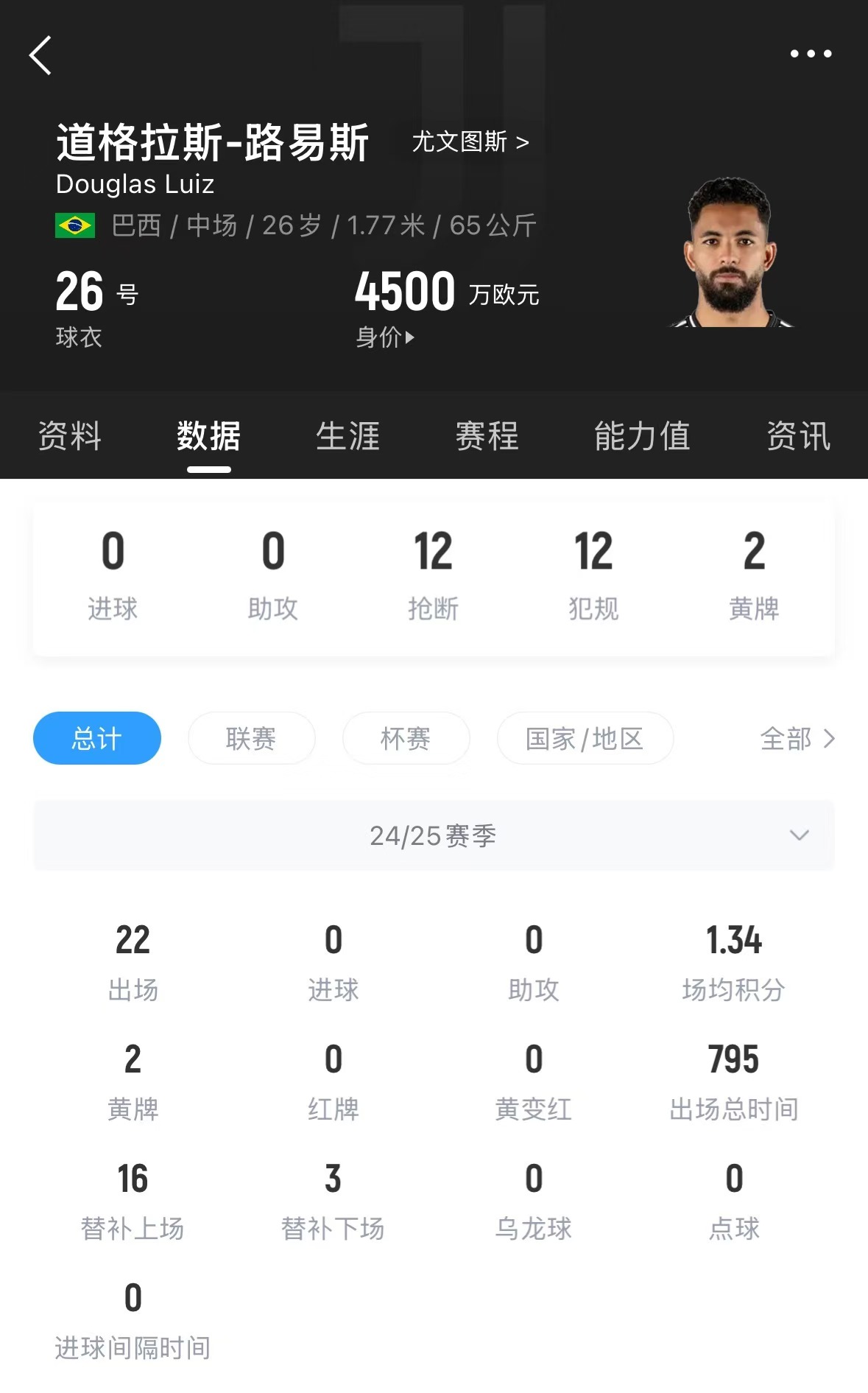5150萬買來!26歲道格拉斯-路易斯22場0球0助,身價(jià)已狂跌2500萬