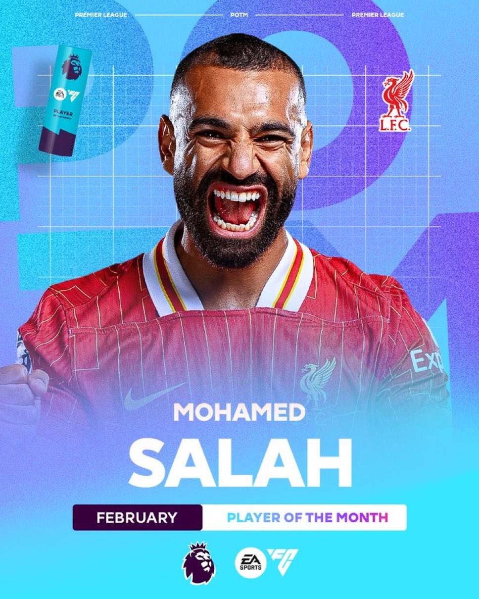 7次獲獎平紀錄!官方:薩拉赫當(dāng)選英超2月最佳球員,2月6場6球4助